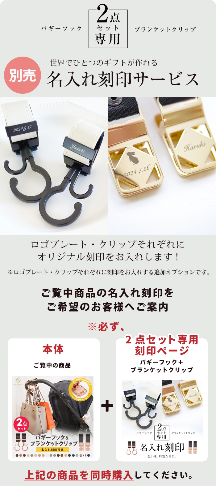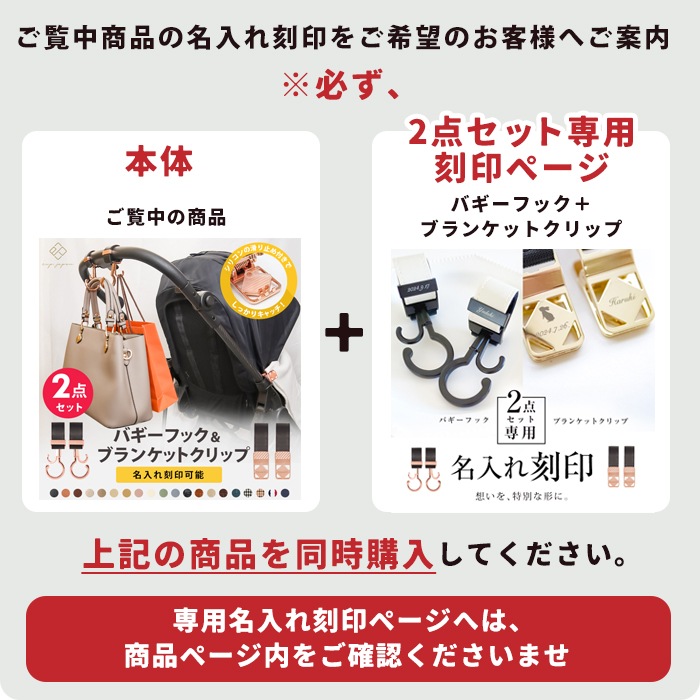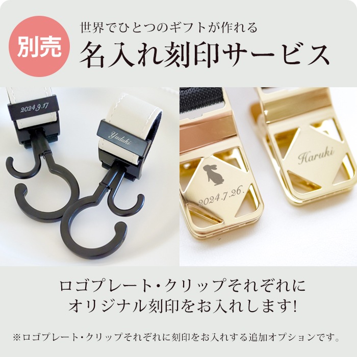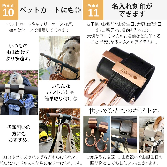 ちょっとした物をかける時に便利。 刻印も無料で入れてもらえた。 またベビーカーにつけているだけで高級感がある。 刻印について問合せをした際も 迅速かつ丁寧に回答いただいた。