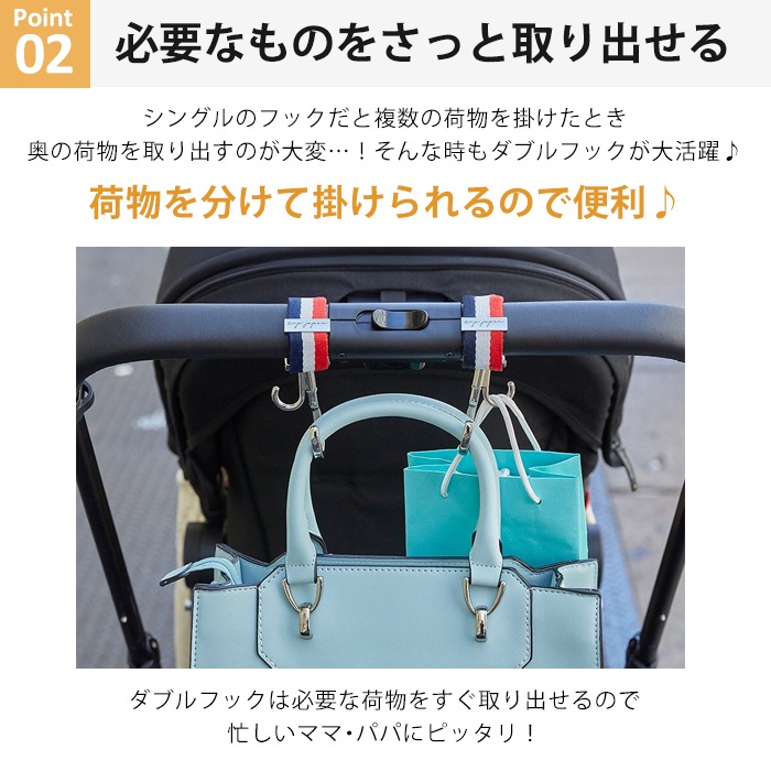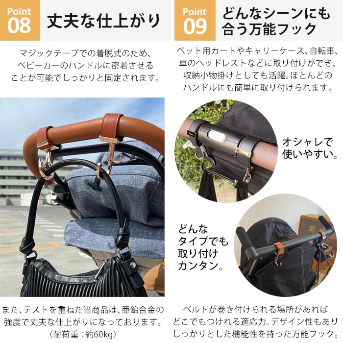 ベビーカーに合う上品でおしゃれなデザインです。 フックは本当に便利です。 寒くなってきたらブランケットクリップもたくさん使いたいと思います。 しっかりした商品でデザイン性が高いので、こちらを選んで良かったです。