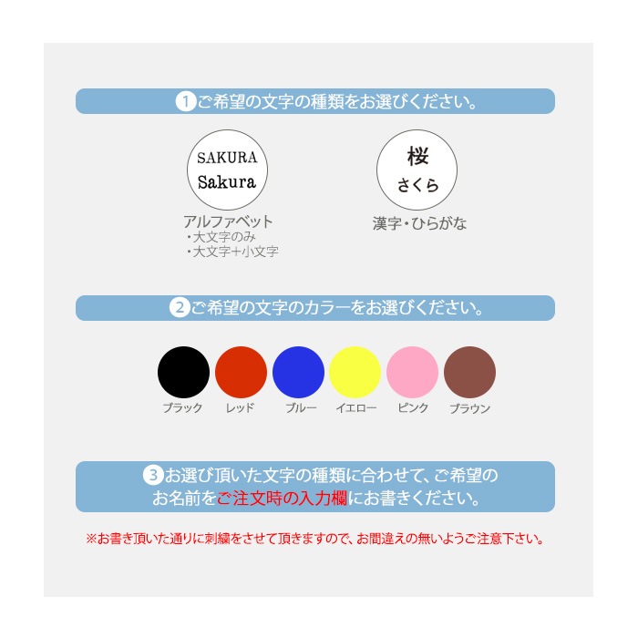 【刺繍糸カラー】(ブラック / レッド / ブルー / イエロー / ピンク / ブラウン)※刺繍不要の方は「不要」とご記載ください。※必須