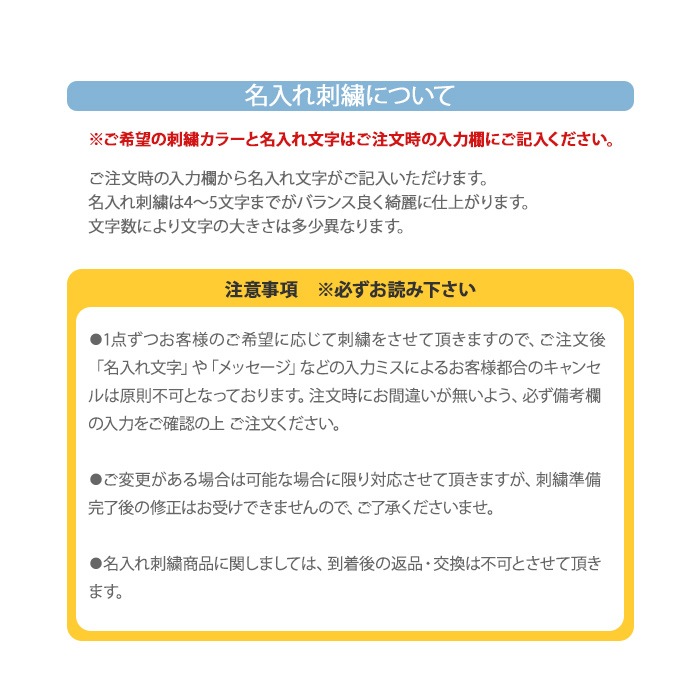 【名入れ文字】(8字以内推奨・記号不可)ご希望のフォントに合わせて、入力欄に文字を入力ください。(アルファベットをご希望の場合は英語でご記入ください)/ 2種類以上の文字の種類はご指定いただけません。※刺繍不要の方は「不要」とご記載ください。※必須