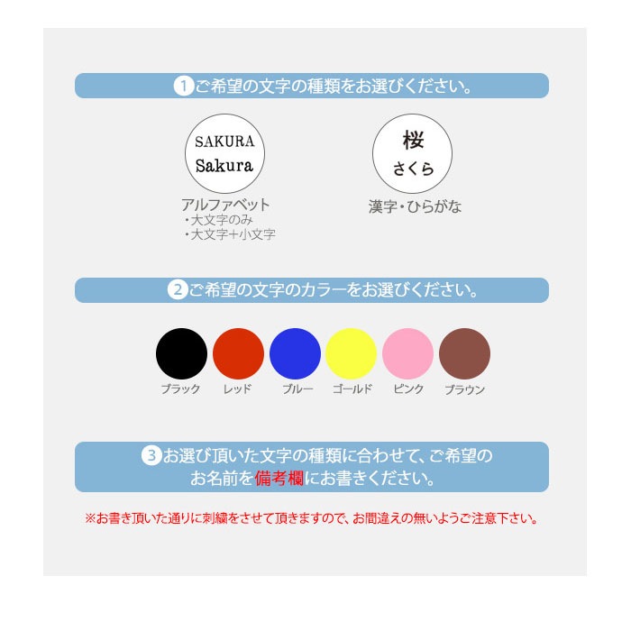 【刺繍糸カラー】(ブラウン / ブラック / ブルー / レッド / ピンク / ゴールド)※刺繍不要の方は「不要」とご記載ください。※必須