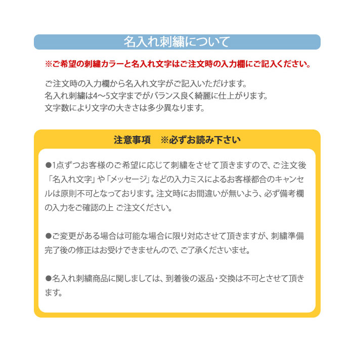 【名入れ文字】(8字以内推奨・記号不可)ご希望のフォントに合わせて、入力欄に文字を入力ください。(アルファベットをご希望の場合は英語でご記入ください)/ 2種類以上の文字の種類はご指定いただけません。※刺繍不要の方は「不要」とご記載ください。※必須