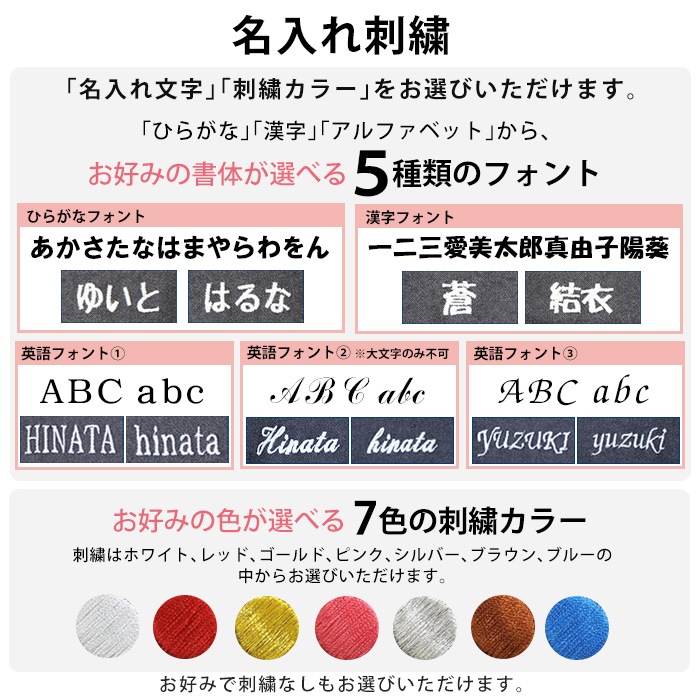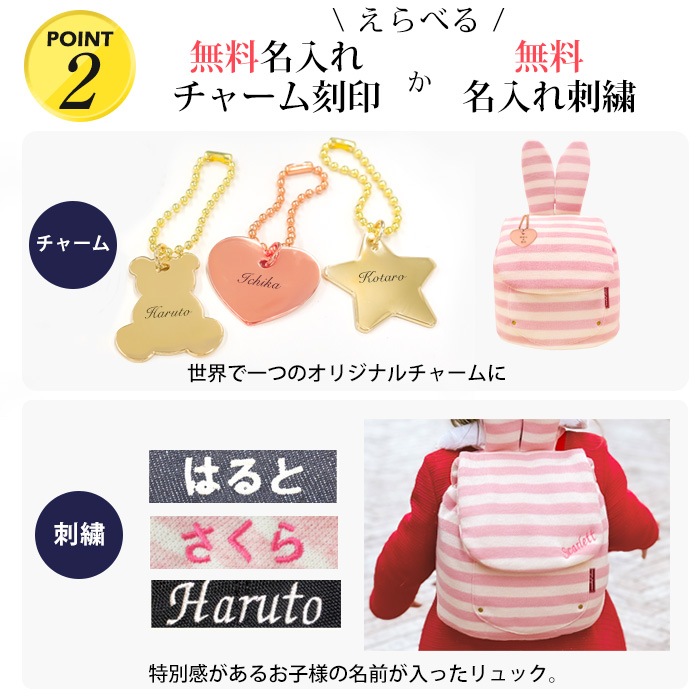 ※無料での名入れは「チャーム」「刺繍」どちらか一方のみです。※必須