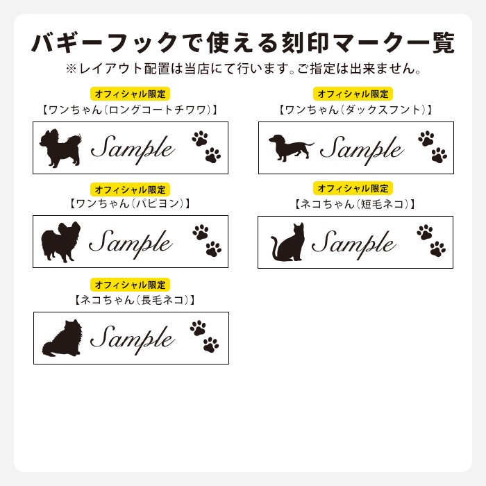 ※刻印が不要の場合、刻印文字は「不要」とご記入くだい。※バギーフックはマークのみの刻印はお受けできません。必ず刻印文字もご記入ください。