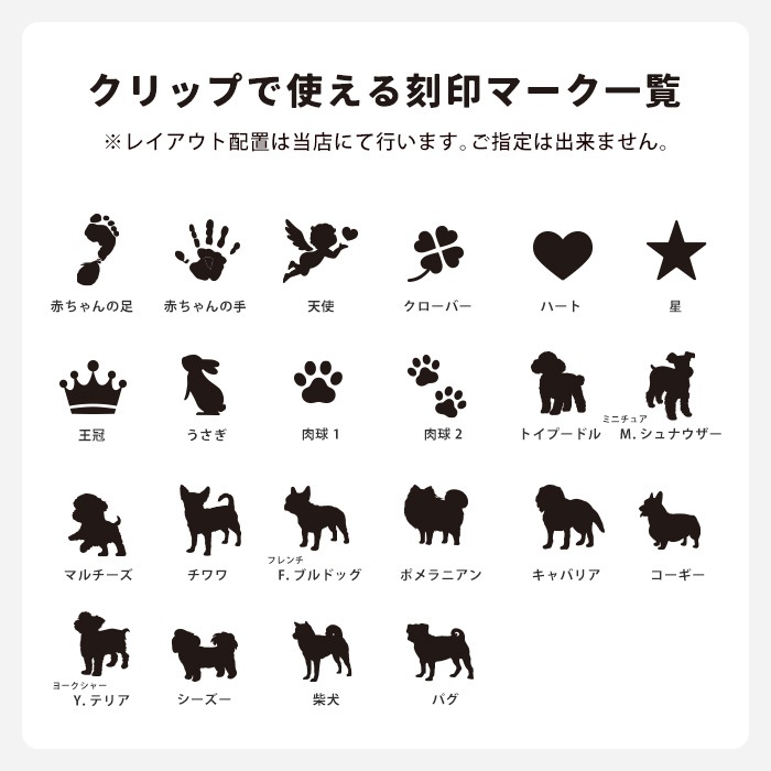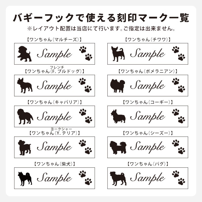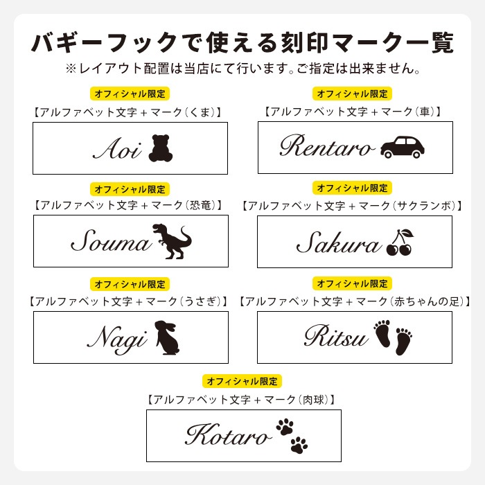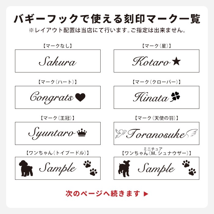 ※刻印が不要の場合、刻印文字は「不要」とご記入くだい。※バギーフックはマークのみの刻印はお受けできません。必ず刻印文字もご記入ください。