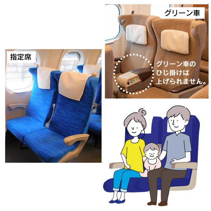 グリーン車はひじ掛けが上がらない仕様になっているため、パパ・ママの間にお子さまを座らせることができません。 その為、ひじ掛けが上がる指定席をオススメします。